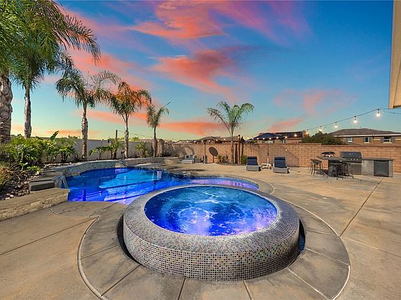 Live the Resort Lifestyle in Audie Murphy Ranch! Don’t miss this incredible opportunity to own a stunning home in the highly sought-after Audie Murphy Ranch Community! Perfectly situated on a prime corner lot just across from Taawila Elementary School, this home is packed with high-end upgrades and luxurious touches. Step inside to discover a bright, open-concept layout featuring premium finishes throughout - stainless steel appliances, quartz countertops, white shaker cabinets, elegant pendant lighting, and luxury flooring. The spacious great room features a fireplace and is perfect for entertaining, seamlessly flowing into a formal dining room and a gourmet eat-in kitchen with a huge walk-in pantry. And just wait until you see the backyard! Designed for ultimate relaxation and entertainment, this resort-style retreat boasts a gorgeous Pebble Tec pool, a custom oversized designer glass-tile spa with a floating edge, towering palm trees, a cozy fire pit, and a built-in BBQ island with a mini bar fridge. The covered patio, complete with double ceiling fans, offers the perfect spot to unwind year-round. This exceptional home features 4 spacious bedrooms, including one downstairs, a versatile loft that can easily be converted into a 5th bedroom, plantation shutters, and blinds throughout. The 3-car tandem garage comes with a brand-new insulated garage door, while added upgrades include a Vivint security system, a RainSoft water softener, upgraded fireplace, LED lighting, rain gutters, and custom landscaping. Beyond your private paradise, Audie Murphy Ranch offers unmatched amenities, including resort-style pools, spas, sports courts, a clubhouse, scenic trails, a skate park, and close to schools. Conveniently located between the 15 & 215 freeways, this home is just minutes from shopping, dining, and the renowned Temecula wineries.