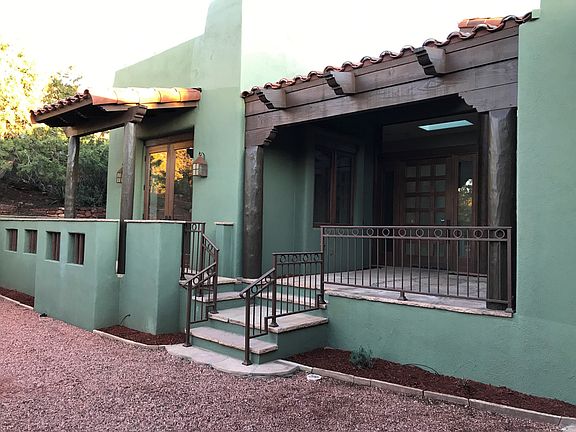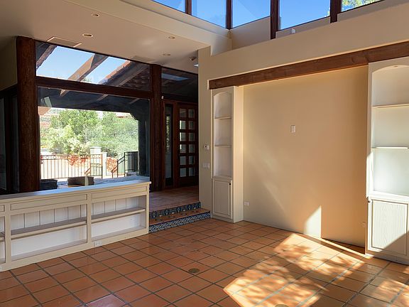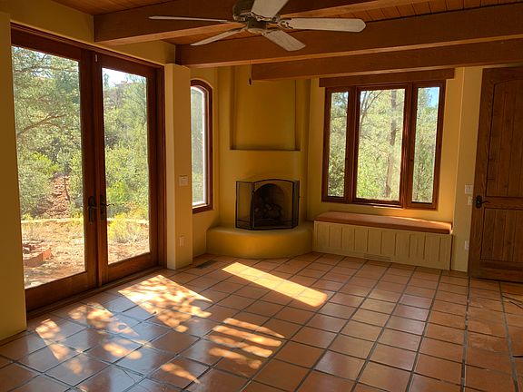 Santa Fe Masterpiece in coveted Mystic Hills. Don Woods' stunning architecture shines through this 2bdrm + den + 2 bth tranquil home on nearly 1/2 an acre. Floor to ceiling windows & doors areas breathe in light and picture views of Elephant Rock, trees & nature. Marvel at the viga posts, Latilla & wood beamed ceilings, saguaro ribbed cabinetry, custom made doors & Mexican tile. Den currently used as a formal dining room w/full retractable windows for al fresco dining. Efficient gourmet kitchen features Thor restaurant quality GAS Range, tin tile backsplash, and the colors of Mexico City. 5 Kiva Fireplaces throughout this abode to satisfy coziness and warmth! Enjoy peace & quiet evenings under your front or rear covered patios. Lots of storage space, walk in closets & 2 car garage. Steps