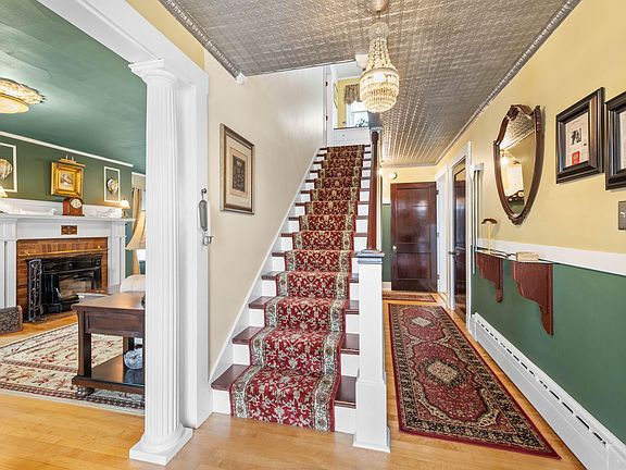 Step into this stunning 2400+ sq. ft. Dutch Colonial home, where timeless charm meets modern comfort. From the moment you enter the beautiful foyer, you'll be captivated by the elegance of the original tin ceilings and original staircase as well as the gleaming hardwood floors throughout. This home features wrought iron baseboard heating and heat pumps for cooling, along with energy-efficient windows that bathe the front of the house in sunlight from sunrise to sunset. The spacious living room, complete with a wood-burning fireplace, is perfect for relaxing or entertaining. A cozy Solarium offers a unique opportunity for a home office or study. The dining room flows into a newly updated kitchen, complete with ample  cooking space and a butlers pantry.  A first-floor bedroom offers a full bathroom that has been tastefully updated and features radiant heated floors. Upstairs, you'll find four generously sized bedrooms with large closets and built-ins, along with an updated full bath with tub. This property is situated on a nearly 2/3-acre open, level lot. The backyard is an oasis, featuring a cobblestone patio, a gazebo and privacy fencing. Perennial gardens, including established blueberries, raspberries, and strawberries, add to the charm. Additional highlights include a sunroom for morning coffee, a garage lined with stunning solid wood beadboard, and proximity to shopping, dining, area beaches, and major roadways. Move right in and enjoy the perfect blend of classic design and modern updates. This home is ready to welcome you!