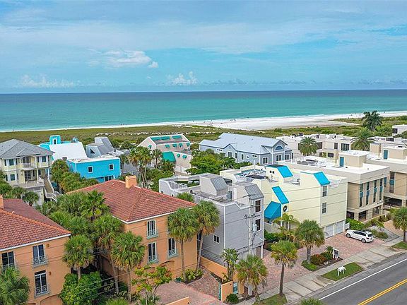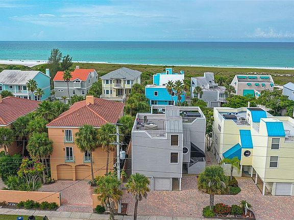 Siesta Key, Gulf Side, just steps to the crystal powdery sands of Crescent Beach - down a private pathway. This charming Florida beach house is also a short stroll to the vibrant Siesta Key Village with fine dining, shops, and an active night life. Cozy living area on the main floor with large open kitchen, open office area and half bath. Third floor features 3 bedrooms and 2 full bathrooms. Roof top deck is ideal for watching the ever changing beach sky and dramatic sunsets. One of the most sought after locations on Siesta Key. Enclosed garage for all your extra toys.
