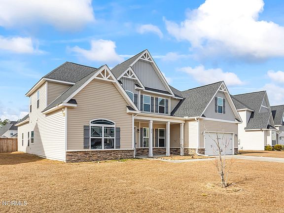 This home features a first-floor master suite, a serene haven with a large walk-in closet and an attached sitting room. Architectural splendor continues upstairs with four additional spacious bedrooms, each boasting vaulted ceilings, and large closets. A walkway on this floor overlooks the living area, adding to the home's expansive feel.
