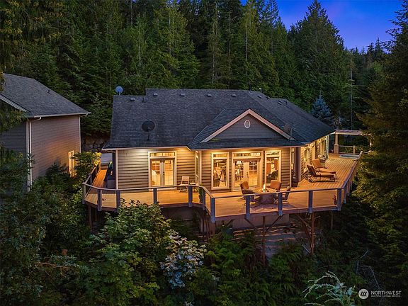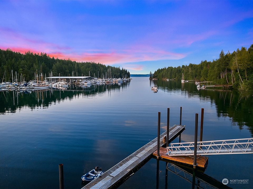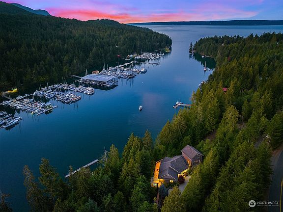 Perched above 175 ft of Hood Canal waterfront overlooking Pleasant Harbor Marina is an immaculate, private, single-level home sited on an evergreen-filled 4.6 acres. Permanently moor your yacht and smaller vessels simultaneously on both sides of the protected 45-ft deep water dock. The new 90-ft float is shared with the adjacent 4.6-acre parcel, also available for total privacy and additional building space. Enjoy a meal on the waterside deck or by the fire inside the wood-clad vaulted open concept living area. Wrapped in mature landscaping with a boardwalk leading you to the ramp, access your boat w/o stairs. Easily finish the 700 sq ft above the garage into a studio. Seller Financing for qualified buyers: 40% down, 6% int, 5-yr balloon.