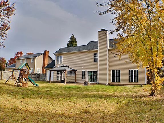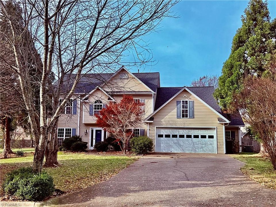 This large two-story home features a spacious front yard and a fenced-in backyard. It includes a two-car garage with an attached storage area or workspace. Garage doors can be accessed w/ an app. Inside, you'll find a roomy eat-in kitchen, a living room, a separate office area, and a den with a gas fireplace. On the second floor, the primary bedroom offers a garden tub, a separate tiled shower, and a large walk-in closet. There are also three additional bedrooms, a laundry room, and another full bathroom on this level. The home is conveniently located near Kernersville amenities and is close to High Point, Winston-Salem, and Greensboro.