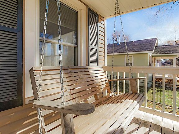 Charming home in a GREAT location! You'll love the gleaming hardwoods throughout the main floor! Spacious family room with ceiling fan and blinds. Kitchen with white cabinets and convenient laundry/mud room off the kitchen and full bath with shower. Washer/dryer stay! One bedroom on the main floor includes a large walk-in closet that could be used as a 2nd master or office. Formal dining includes a built-in glass cabinet and cool spiral staircase that takes you upstairs to even more living space. Upstairs master includes a private deck, walk-in closet, and private half bath. Additional bedroom upstairs and hall bath with shower/tub, tile floor, and double vanity. Inviting front porch with swing, a large deck in back with access to the upstairs! The detached garage is spacious and functional with plenty of space for a workshop and all your projects! Located just blocks from downtown Pleasant Hill. Come see this amazing home!