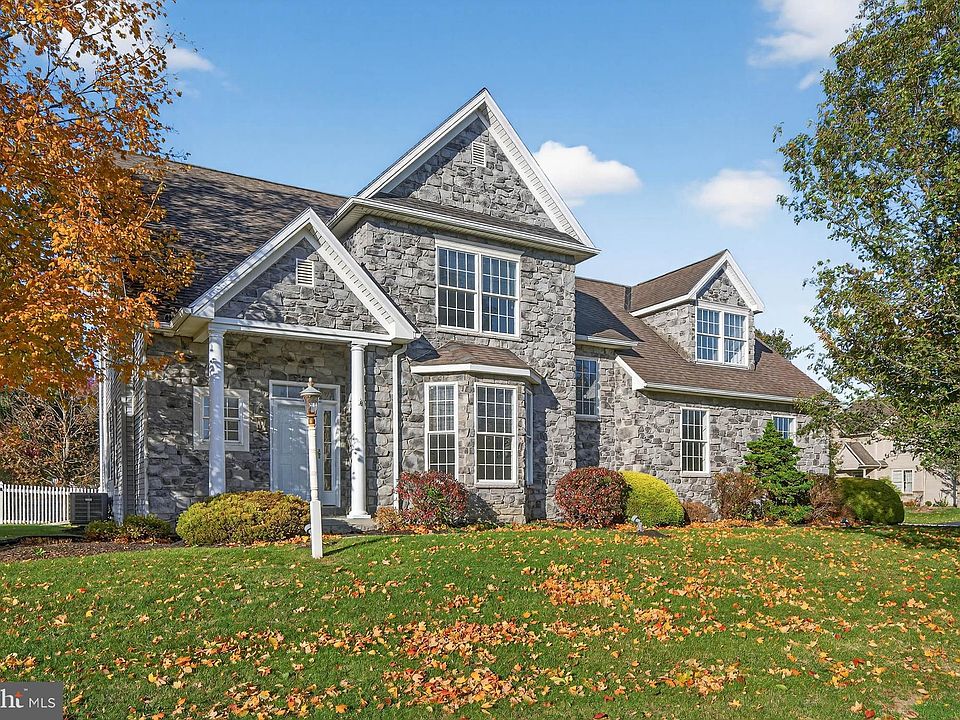 Welcome to this beautifully maintained corner-lot home, where elegance, comfort, and modern convenience come together effortlessly. Step inside the inviting foyer, where crown molding and gleaming hardwood floors set the tone for the rest of the home. The formal dining room is a perfect spot for gatherings, featuring timeless details like chair rail molding, flush mount ceiling lighting, and warm natural light from front facing bay window. A convenient half bath with hardwood flooring completes the main level’s thoughtful design. The two-story great room impresses with its recessed lighting, pendant lights, and abundant windows that fill the space with sunshine—ideal for relaxing or entertaining. The kitchen is a chef’s delight, offering granite countertops, decorative ceramic tile floors, pantry, a central island, and quality appliances including an LG refrigerator, Amana microwave and dishwasher, and a gas range with an iron stove top. The adjoining breakfast nook, accented with decorative tile floor and flush mount ceiling lighting, provides a cozy spot to enjoy casual meals. Your main-level primary suite is a peaceful retreat with soft carpeting, crown molding, and a ceiling fan for comfort. The ensuite bath features dual sinks, ceramic tile, a stall shower, linen closet, and a spacious walk-in closet. Convenient laundry room connected to main bedroom with new Whirlpool clothes washer and dryer and some additional closet space. Upstairs, you’ll find two generous bedrooms with vaulted ceilings, walk-in closets, and ceiling fans. One bedroom even includes a mini split system and attic access for added comfort and convenience. A large hallway cupboard provides excellent additional storage. A full bathroom with a tub/shower combo, dual sink, recessed lighting, and vinyl flooring completes the upper level. The basement offers excellent potential with high ceilings, insulation, a 200-amp electrical system, french drains, bilco doors for access to backyard, and concrete floors—plus a new water heater (2023). Outside, the detailed black stone exterior extends across the front, garage sides, and custom stone mailbox, creating timeless character and strong curbside appeal. The property also features a level, fenced backyard with a patio perfect for gatherings, a charming front yard, and a two-car garage providing ample storage and easy access. This home combines thoughtful design, quality finishes, and inviting spaces—a true gem ready to welcome its next owners.