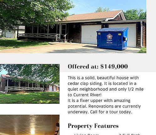 House For Sale- $149,000 This is a beautiful home with cedar clap siding. It is located in a quiet neighborhood and only 1/2 mile to Current River! It is a fixer upper with amazing potential. Renovations are currently underway. Call for a tour today. 3 bedrooms, 2 full baths, Dining Room, Laundry Room/Mudroom, 2 Car Garage, 1252 sq feet Large Outdoor storage building Quiet neighborhood Recent Survey