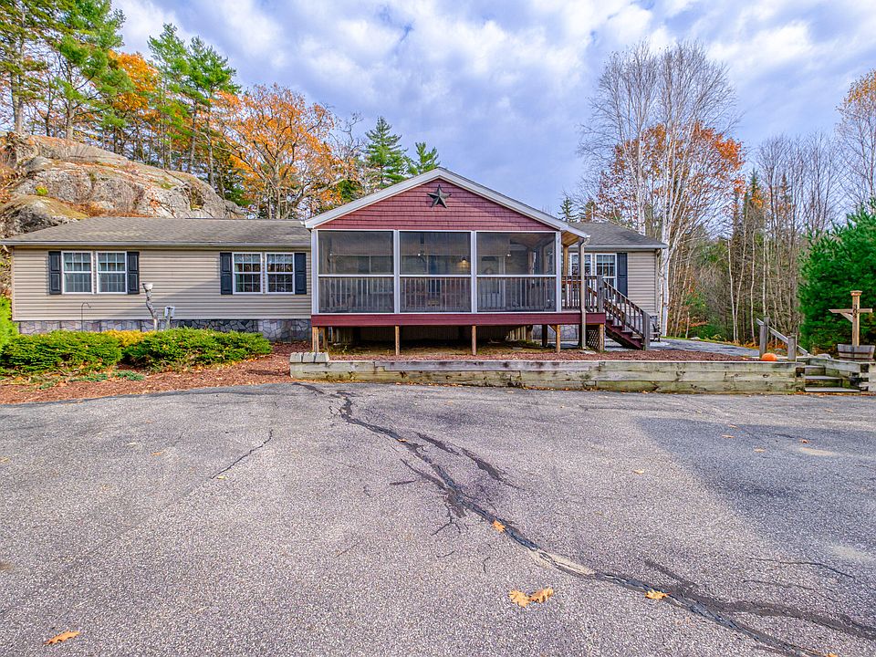 Welcome to 304 Dunn Road, a custom-built manufactured home by Champion Homes. The spacious living areas are ideal for gatherings and entertaining, whether indoors or outdoors. Enjoy the screened-in cedar porch or relax on the back patio, while being overlooked by the largest Ice Age boulder in Oxford County. The home features a large eat-in kitchen with a butcher block island. It includes three bedrooms and two full bathrooms, with the primary suite offering a generous bathroom that features a stand-up shower and soaking tub. There is a formal laundry room and a four-season addition currently used as an office. The oversized two-car garage includes a generator hookup and additional storage above. Situated on five acres of rocky terrain and ridges, the property is home to abundant wildlife.