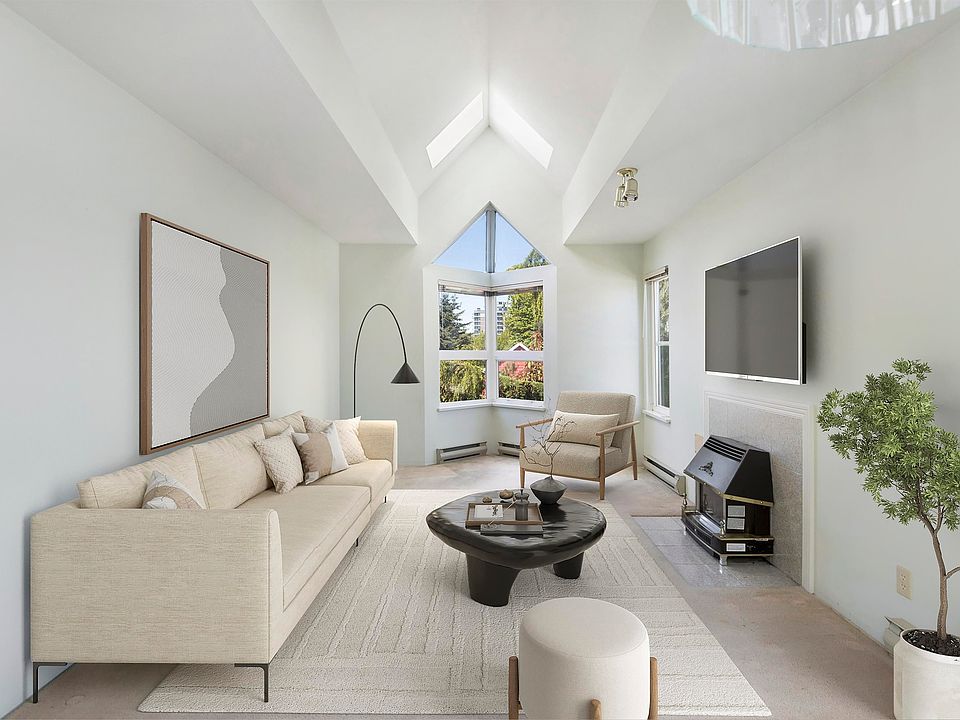 Welcome to your next city sanctuary! Step into this vibrant Mount Pleasant residence and let your creativity soar. There's nothing cookie cutter about this home. It features cathedral-style living w/ city and mountain views from its top-floor NW comer unit. With a spacious 1 bed (fits a king bed)+ solarium & 1 bath offers soaring 12 ft ceilings off the living space and options for in-suite or shared laundry, it's perfect for crafting your ideal living space. Experience the vibrant community and upcoming St. George Rainway project, transforming nearby streets into lush green spaces. With seamless transportation via Skytrain and major bus routes, owning in this sought-after neighborhood has never been more convenient! Comes with 1 parking & 1 storage locker. 1 pet allowed, sorry no dogs.