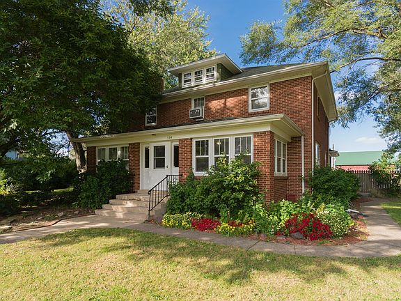 The perfect combination of country and in-town living awaits you! The right size for simple maintenance, coupled with room to play, this 1.84 acre Unit 7 property is surrounded by fields to the North and East. The barn, with a newer metal roof, is great for storage or a workshop, or could be used for a multitude of purposes (it even has a 2nd story hangout space with heat). A detached garage is just next to the home, with a covered walkway into the house. In Spring and Summer, enjoy beautiful gardens surrounding the yard. Inside, four large bedrooms on the second story will easily accommodate a king bed, and one additional bedroom on the main floor could also be used as an office. Both bathrooms have had recent updates, and the home has been updated to 200 amp electrical service. Original hardwood floors are throughout the home, and the exterior brick is stunning. The enclosed heated front porch can be used year-round. Hartman Park is just one block south.