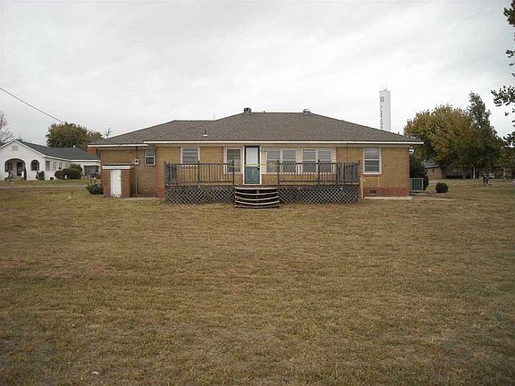 This home sits on a large lot, and features a brick exterior, a big covered front porch, a large wood deck off the back, and a detached garage/workshop combination. Inside features include tile floor and breakfast bar in the kitchen, tile floors in the baths, a utility room, a spacious living area, and the home even has a security system for added peace of mind. There is a view of a field and tree line to the back of the property. This home is located just down the road from the school.