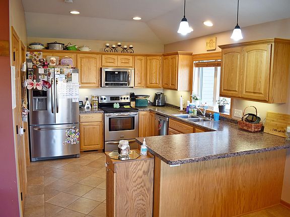 Step into comfort and style with this ranch-style home built in 2011, situated on a quiet cul-de-sac in a newer subdivision. This property offers both functionality and curb appeal, featuring steel siding with vinyl shakes and brick accents, a triple-stall garage with in-floor heat, and a large yard complete with a yard shed for extra storage. Enjoy outdoor living with a composite deck and concrete patio, ideal for relaxing evenings or entertaining guest. Inside, you'll find an open-concept layout that connects the living room, dining area, and kitchen. The kitchen is equipped with oak cabinetry and a sit-up counter, perfect for casual meals or your morning coffee. The main floor also includes two bedrooms, full bathroom and mudroom with laundry hook-ups. The finished basement expands your living space with a large family room, two additional bedrooms, a full bathroom, and a utility room-plus the added comfort of in-floor heat throughout. This home offers a great blend of modern convenience and inviting charm-ready for you to move in and enjoy!