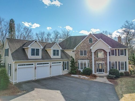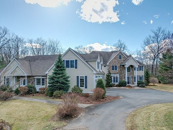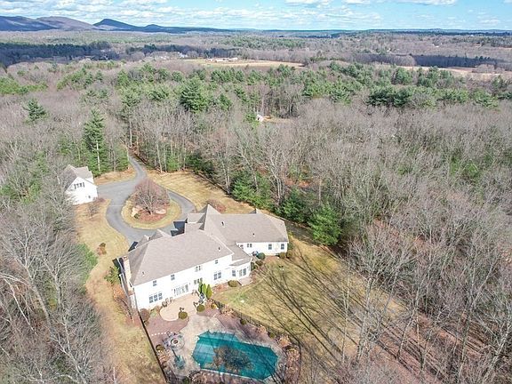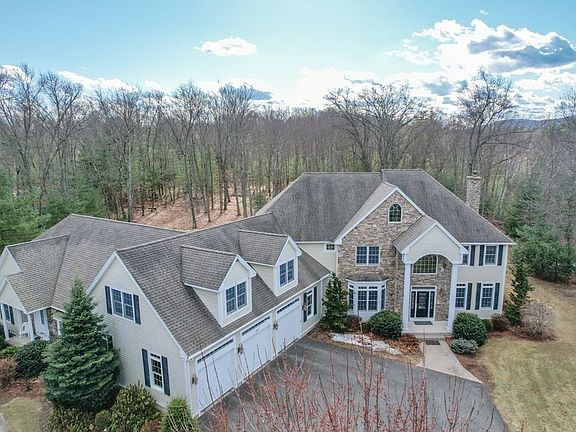 Private retreat with 1300 sf in-law home that abuts town conservation land and hiking trails. Main home includes 4 bedrooms that all have their own private bathrooms. Custom kitchen that is open to family room with wood burning fireplace. Formal living room with coffered ceilings and gas fireplace. American cherry floors throughout most of the main home and the in-law home. Sunroom and huge exercise room or bonus room shared by both homes. Laundry room with two washers and two dryers. This home even has a movie theater with three rows of stadium seating, bar with granite counter, pool table area and dance or yoga room with raised bamboo floor. Enjoy the in ground pool in the very private yard. There is a three car attached garage, along with a additional three car detached garage with 14 ft ceilings and a huge 2nd floor that is sheet rocked and could be finished into a large art studio or work area. Minutes to all five colleges and 20 mins to Baystate Medical. Details sheet attached