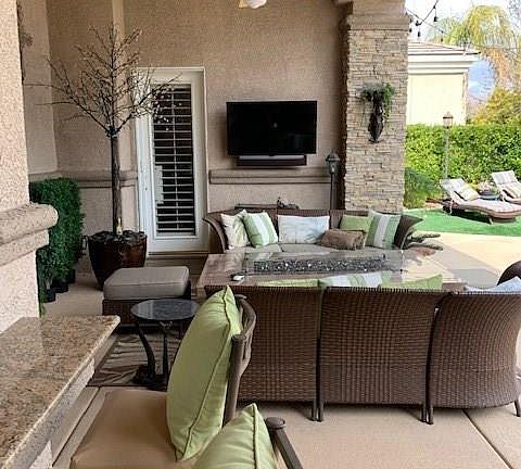 Desired community. Open plan. 12' ceilings w/ tall doors. Marble flrs, granite counters, huge gourmet kitchen, lighted pot shelves stone wall,Wolf Appliances, 6 burner gas top w/ hood, eating area. Custom pantry door. Formal dining,Custom lighting, sunken wet bar. Shutters,remote controlled shades, big mstr w/frpl,hrwood,outdoor kit coverd patio auto shades, Blt storage shed. office,glass dbl drs all new all new 2 air cond,roof,paint,pool pump