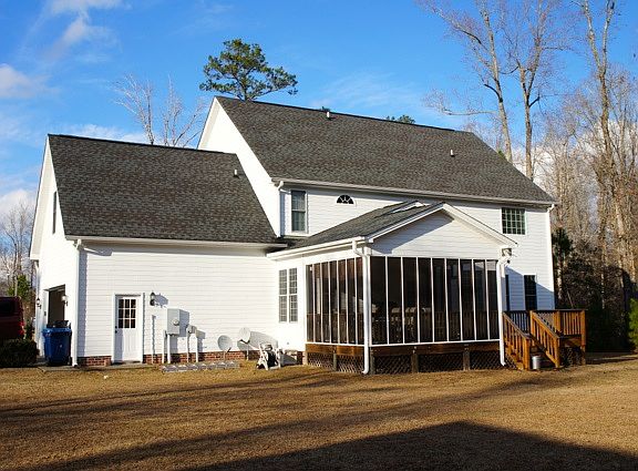 Gorgeous 4 bedroom 3.5 bath custom home with 3148 sqft of living space on approx. 3 acres PLUS 2 car attached AND 2 car detached garage (with additional over garage storage). Corian counter tops with 42" high and 15" deep cabinets. Large bedrooms to include sitting area and upstairs porch access in Master Bedroom. 9 ft ceilings downstairs, oversized, 2-piece crown molding, dining room chair rail. In ceiling speakers in Living , Dining, Family, Kitchen, Master Bed, and porches. Upstairs laundry with cabinets and counter top. Mud room with cabinets and custom built coat area. Large family room with custom stone fireplace. Formal carpeted dining and living room w/ french doors, can be used as an office. 4th bedroom has own full bath, closet, and 2 walk-in attic access doors. All bedrooms and laundry upstairs. Covered screened porch with adjoining uncovered deck opens to a large, private back yard surrounded by woods on quiet cul-de-sac in executive neighborhood. Great for parties or watching the kids play on your private playground. 4 miles from MCAS New River, easy access to Lejeune via 24 Bypass (and New Wilson Gate). SW Walmart, Lowes and shopping less than 2 miles away.