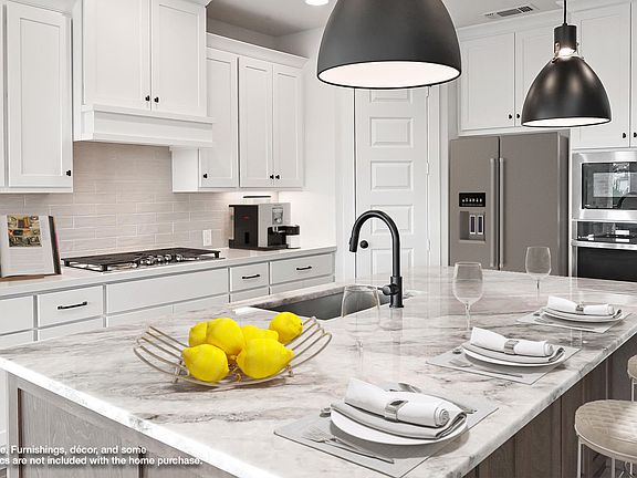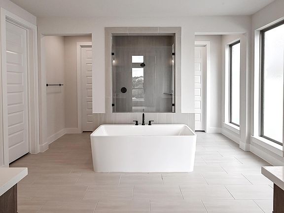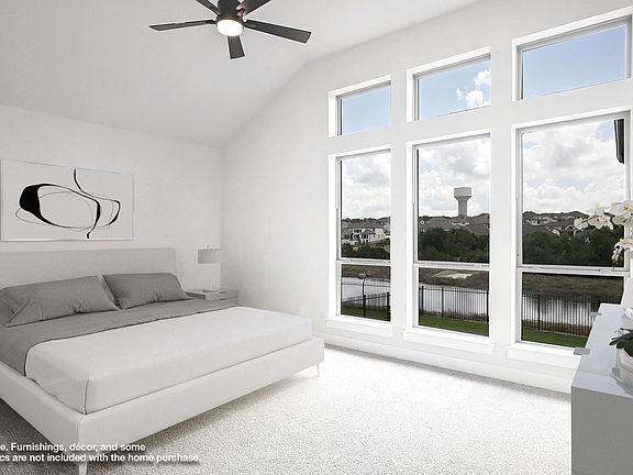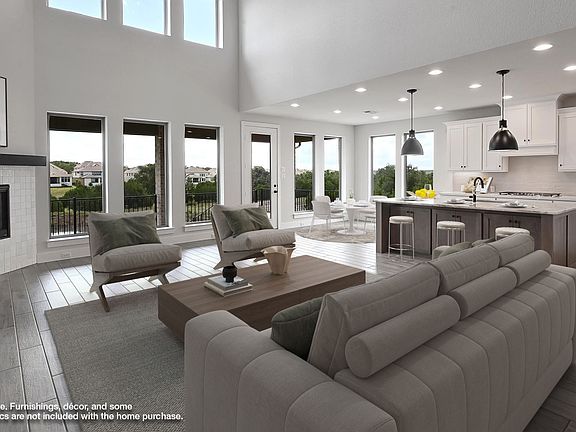 Home office with French doors frame the entry with 19-foot ceiling. Formal dining room flows into the family room and kitchen. Family room hosts a wall of windows, a wood mantel fireplace and a 19-foot ceiling. Island kitchen with built-in seating space, 5-burner gas cooktop and a corner walk-in pantry flows into the morning area. Primary bedroom with a wall of windows. Primary bathroom hosts a French door entry, dual vanities, freestanding tub, separate glass enclosed shower and two walk-in closets that offer private access to the utility room. Additional bedroom with walk-in closet on first level. Second level hosts secondary bedrooms, a Hollywood bathroom, game room and a media room with French doors. Extended covered backyard patio. Mud room just off the three-car garage with additional garage bay space. Representative Images. Features and specifications may vary by community.