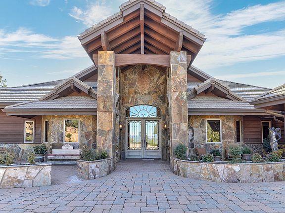 patio guarded by custom boulder placement and a stunning on-suite bathroom. This level is complete with an office, an expansive living room with a sunken bar, and a kitchen to brag