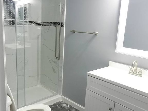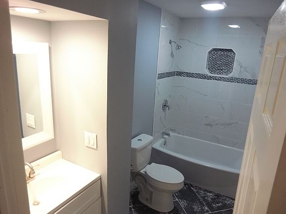 Large Bathroom with Marble Tiled Tub Shower and Storage.