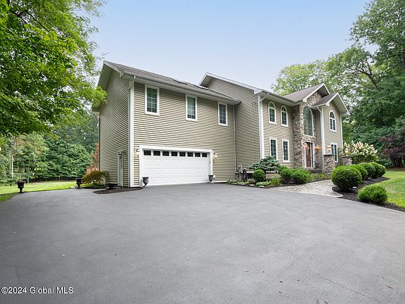 This stunning 4 bedroom, 2 full/2 half bath home boasts a spacious and warm interior, an expansive outdoor entertaining space, and attention to detail that sets it apart. Vaulted ceilings in the main living areas and each bedroom, hardwood floors, granite countertops, a california closet outfitted storage room, a french-door entrance office, a fully finished basement and more define the interior spaces. The exterior stuns with a three-level deck, an outdoor kitchen, a Grecian Tee inground pool, a fully lit basketball court, a two story shed and more! Inside the two car garage you will find epoxy flooring and expansive overhead & walled storage compartments. This exceptional property offers one-of-a-kind living in the East Greenbush School District!