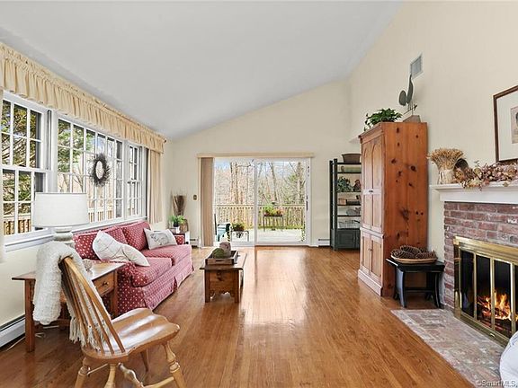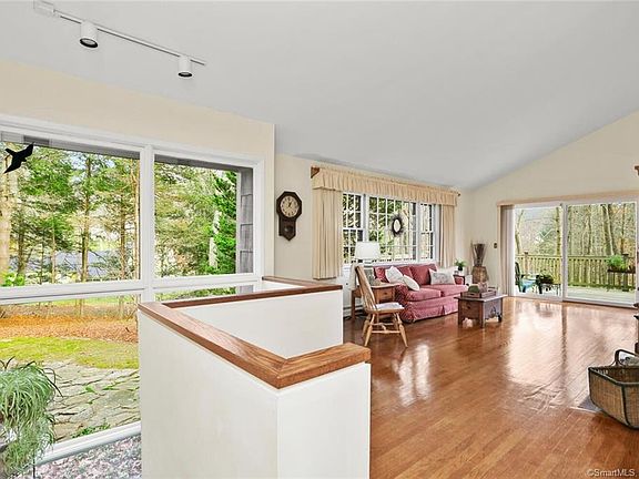 Meticulously maintained home surrounded by the natural purity of Lower Easton in Fairfield County. As you step in the front door of this relaxed ranch, the home opens up to stunning floor to ceiling windows, soaring ceilings, and hardwood floors throughout. Spotless eat-in kitchen with skylight, exposed brick wall, and butcher block countertop opening to great room with vaulted ceiling and fireplace. Step outside from the great room and dining room onto the wrap around deck as the sun sets gently over the trees. Two spacious bedrooms and two full bathrooms complete the main level. The Master Bedroom has woodland view, vaulted ceiling and walk-in closet. This home boasts 1,978 finished square feet of living space with the walkout lower level providing an office, recreation room with fireplace, laundry room/bathroom and private patio. Charming landscaping with evergreen moss pathways and stone borders. Low maintenance yard. Natural Gas, Central Air, City Water, 3 Zone Heating. Oversized 2 car garage with zoned heat. Top Rated Schools. Easy access to the Merritt Parkway, Local Farms, Dining, Golf, Hiking, Shopping. *This home has been converted from a 3 bedroom to a 2 bedroom home in order to provide more spacious bedrooms. It can easily be converted back to 3 bedrooms. The walk-out lower level also provides many opportunities for visitors.