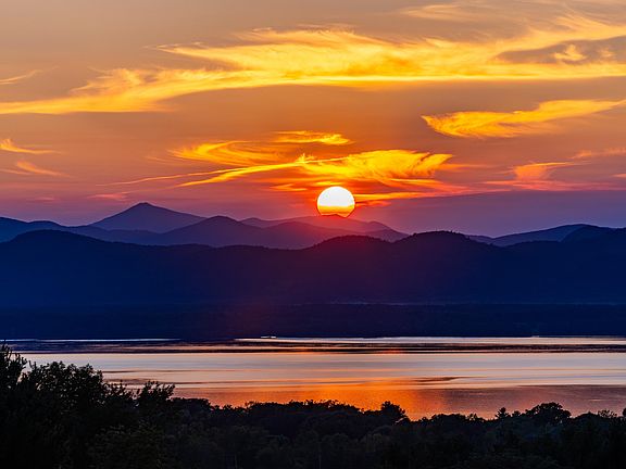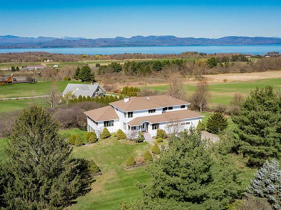 The views of Lake Champlain and the Adirondacks from this five-bedroom contemporary home are incredible. Long distance views west, north and south. Year round Sunsets! The wraparound windows and open floor plan make for a fun home in northern Vermont. Sit for hours and watch the sunsets and changing seasons from this stirring view. The main level offers multiple seating areas, a large dining area, a woodburning fireplace, private office, large cooks kitchen with granite counters, cooktop and designer hood/cove, and double wall ovens. Plenty of counter space in the kitchen to cook for a gang while watching the view! The mud room is what you need in Vermont for skis, sports equipment and more plus it's located next to the oversized laundry room. Perfect! You can run downstairs from the back staircase to the family room, game room, fifth bedroom, and tv room (ready for a theater room to be created!). The second level has a private primary bedroom ensuite and a large walk in closet and dressing room. In addition, on the second level are two bedrooms with bathroom and a private fourth bedroom ensuite with bathroom facing the view. The lawns are private as well as the patio and hot tub. The proximity to the Charlotte Beach, Mt Philo State Park and the many conserved areas in Charlotte offers great outdoor recreational opportunities. Burlington VT is 20 min close by. Be sure to watch the video to capture the view!