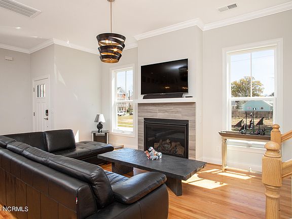 As you enter inside, you'll notice the finished white oak solid hardwood flooring that flows throughout the main living areas. The open concept living room features a gas log fireplace with a beautiful mantle and granite surround, perfect for cozy nights in. The crown molding adds an elegant touch, highlighting the high ceilings and spaciousness of the home. Head out onto the covered porch and enjoy the beautiful views of the surrounding area. The kitchen is a chef's dream, with granite countertops, GE appliances, tile backsplash, breakfast bar, and beautiful white cabinetry. Entertain guests in style in the dining area. Retreat to the owner's suite, which boasts dual vanity sinks, granite countertops, and a large, tiled walk-in shower. The additional bedrooms offer plenty of space for guests. Conveniently located just a few blocks away from local shops, dining, and activities in Historic Downtown New Bern, this home offers the best of both worlds. Additional features of this luxury home include a Rinnai tankless water heater and energy-efficient windows. Don't miss out on the opportunity to own this beautiful home in an unbeatable location. Call us to schedule your showing today!
