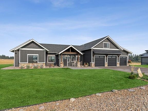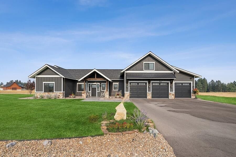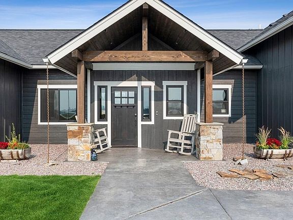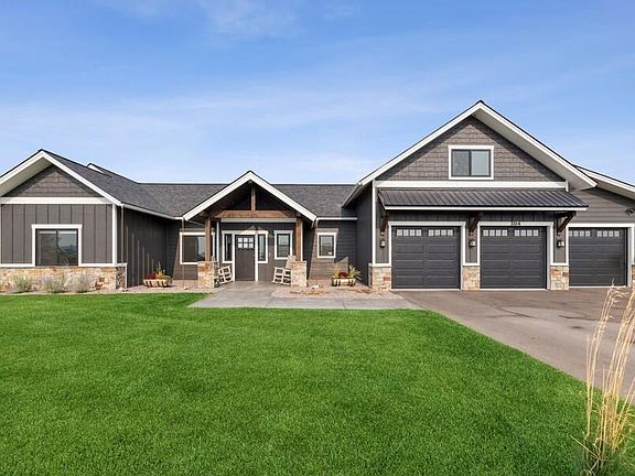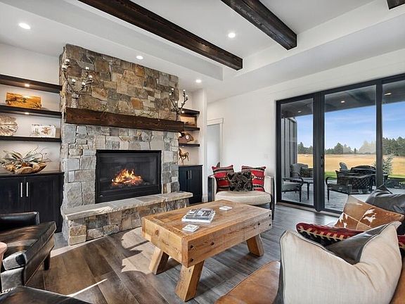 Enjoy 360-degree majestic views with direct access to the private neighborhood lake for swimming, stand-up paddle boarding, or waterskiing. This stunning, mountain modern home, built in 2021, includes 5 bedrooms, 4.5 bathrooms and is being sold with all new furnishings that fit beautifully in the home. It lives large, with the master and 3 of the bedrooms sitting on one level. The master bedroom is separated from the others, creating a private oasis with its own step out to the patio. The luxurious kitchen, with gas burner range, dual ovens, Quartzite countertops, island and separate dining area create an open concept which is also flows beautifully to the living room, accented by its large stone gas fireplace and custom built-in cabinets. The living space extends outdoors to the large, covered back patio with massive views. Situated on just over an acre, this prime lot is bordered in the back by common space that overlooks mountains and trees providing a private and peaceful setting with spectacular views out every window. Neighborhood is also equipped with fiber internet. All within minutes to the airport, shopping, hospitals, schools and more. Call Amy Stevens at 406.249.6496 or your real estate professional.