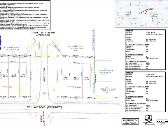 In the city of Riverdale, Clayton County, Georgia, I have four (4) adjacent parcels: two (2) of these parcels are zoned single-family residential, and I subdivided these two parcels into five (5) single-family lots. In addition, the other two (2) other parcels which are zoned multi-family, I subdivided these parcels and created a total of six (6) detached townhome lots. FYI - since these two particular parcels are zoned multi-family they can also be developed and used as a small apartment project, should you decide that as an option. And that may allow you to place one structure on each of these parcels and allow you to yield more units. Yet, I'm selling these two parcels as a detached townhome project. (See attached files.) From the attached files, you will see that all of these parcels and proposed lots are utilizing the existing street frontage; therefore, development costs is very minimal; therefore, my asking price for the SF lots is $35,000 per lot totaling $175,000 and $30,000 per lot for the MF lots totaling $180,000. This yields a total asking price of $355,000. This project will be sold with an approved set of construction plans.