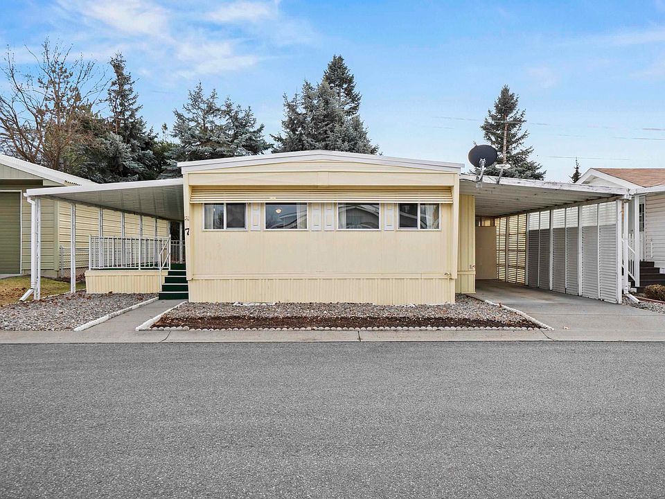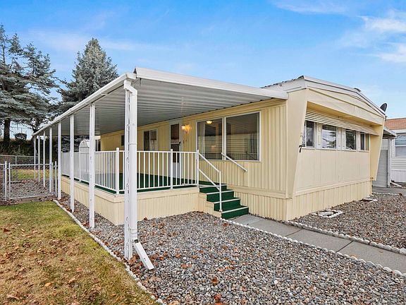 Fabulous opportunity to live in an amazing and desirable 55+ community located in south Spokane Valley with easy access to stores, hospitals, and freeway access! The doublewide mobile home has a lot to offer! Larger primary suite with half bath and an abundance of closets/storage. The office/den could be a smaller bedroom. Private backyard with sprinkler system. Covered front porch and carport, plus additional storage shed and enclosed workshop area. Rent includes water, sewer, street snow removal and summer debris dumpsters. There is a community center to enjoy activities if desired with your friends/neighbors. Needs new flooring in living room.