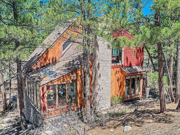beautiful Pine Trees. A very secluded Property barely visible from the main road. A custom built home that is like walking into a time capsule!!! Designed and built by owner. A solid and very well built home. 2x12 ceiling joists, 2x6 walls, floors are of 2x10 with 3/4 inch subfloor with 3/4 inch solid oak floors. The craftsmanship and overall build of the home is not often seen anymore. The way it is nestled in-between all the the pine trees gives it a tree house effect, Very Unique and Very private with a WELL and Septic system. Has a large sun room with a hot tub, skylights throughout the home, Ceilings are rare and made of beetle kill Pine The living room has a beautiful stone wall with a wood stove and a high vaulted ceiling as the focal point. The home comes with a laundry shoot to make quick access to getting the clothes to the washer. Exterior has Unique hardy board on the upper exterior siding.