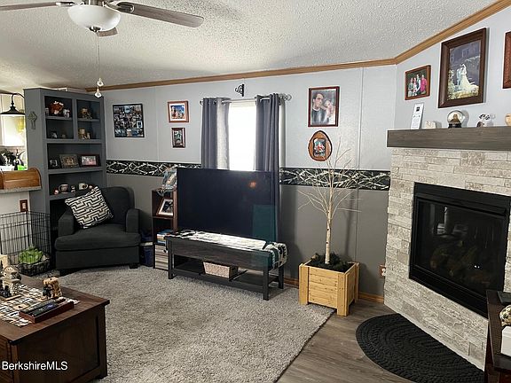 Move-in ready 3 bed, 2 full bath manufactured home w/cathedral ceiling, propane fireplace, separate laundry room & many updates. New hardwood laminate floors & floor moldings. Kitchen updates include marble countertops, cabinets, & wainscoting dining area. Primary bath features walk-in shower & double vanity. New furnace & two new propane tanks. New pressure treated front porch w/fully enclosed entry and 16x8 pressure treated rear deck.
