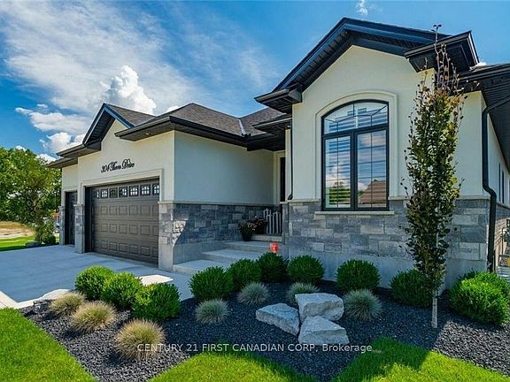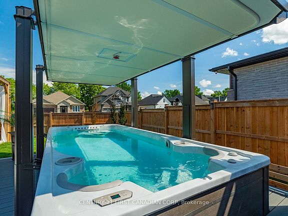 Welcome to 304 Thorn Drive in Strathroys desirable North end.This property presents an unparalleled blend of elegance and comfort. This exceptional executive bungalow, boasting 4 beds, 3 baths, a 3 car garage, 17' Hydro pool swim spa with automatic hydro lift cover and backyard oasis with outdoor kitchen w/sit-up bar with waterfall leather granite countertop, Napoleon BBQ, outdoor fridge, and a 12x12 pergola with a concrete pad, captivates with its meticulous design and amenities.The elevated exterior features stone skirt, stucco, and professionally landscaped grounds, setting the tone for sophistication. Inside, the main level impresses with 9 ft ceilings, crown molding, and California shutters throughout. The master bedroom flaunts a spa-like Ensuite with a standalone soaker tub and glass-tile shower. Entertainment comes effortlessly in the open-concept great room adorned with a tray ceiling and a cozy gas fireplace. The kitchen, a culinary haven, showcases stunning white cabinetry, quartz countertops, double wall ovens, and top-tier stainless steel appliances. The dining room seamlessly connects to a stunning backyard oasis, complete with a 14.6x9 covered porch and full outdoor kitchen, additional composite decking lounging areas, and an irrigation system, all set amidst lush greenery and a privacy fence. The lower level is an inviting retreat perfect for guests, featuring two generous bedrooms plus a gym area that could be converted to 5th bedroom or office, a full bath with quartz countertops, a games room/children's play area, and a great room complemented by a built-in bar and ideal space for relaxation and entertainment. Conveniently located near the 402, schools, parks, and shopping, this home offers easy access to amenities. Additionally, Memorial and Conservation walking trails are steps away, perfect for nature enthusiasts. Do not miss this opportunity to experience the luxurious lifestyle Book your showing today & witness the epitome of refined living.