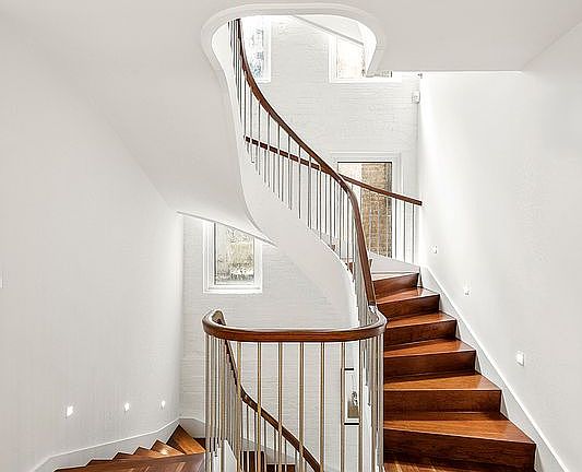 The owner’s triplex features cherry wood floors, custom cherry wood built-ins, stylish lighting, tall casement windows, and distinctive Tibetan carpeting.