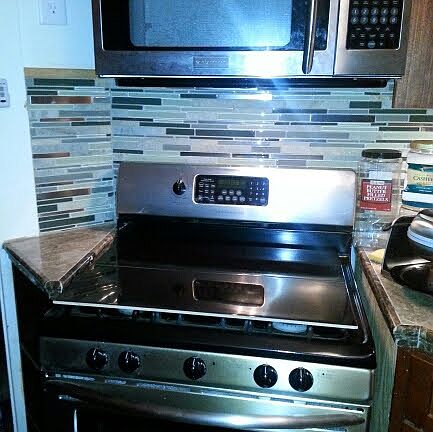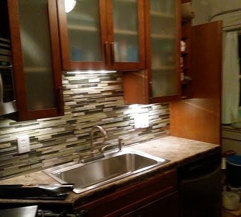 - A modern kitchen with stainless steel appliances, mosaic tile backsplash, and solid wood cabinets