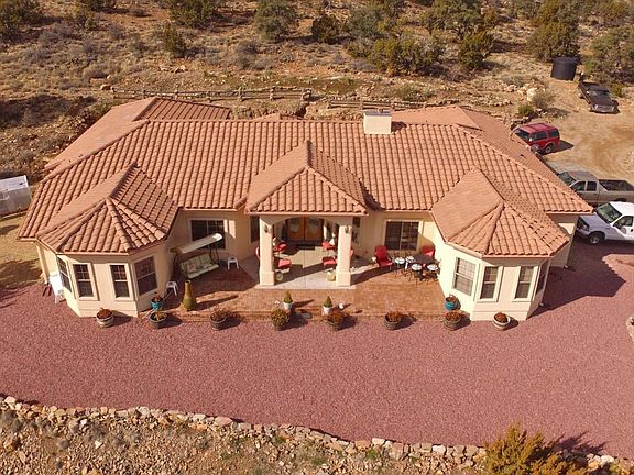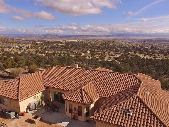Absolutely incredible views as you sit atop the Chino Valley basin with clear views of Eastern and Northern Arizona. With the setting of the house being directly east you will catch every amazing Arizona sunrise. The home sits on 5 beautiful acres full of wild life and privacy. The build of the home is full of quality and has a well thought out floor plan. The favorite area of the home is the amazingly updated and large kitchen with tons of cabinet space, granite counter space, double oven, separate cook gas cook top, and plenty of room to move around. The master suite on the north wing of the home has tons of space, natural light and it own private living area or wisdom room. The master bathroom has its own jetted tub, walk in shower, and double vanity sinks. 24 hour whole house battery backup system.