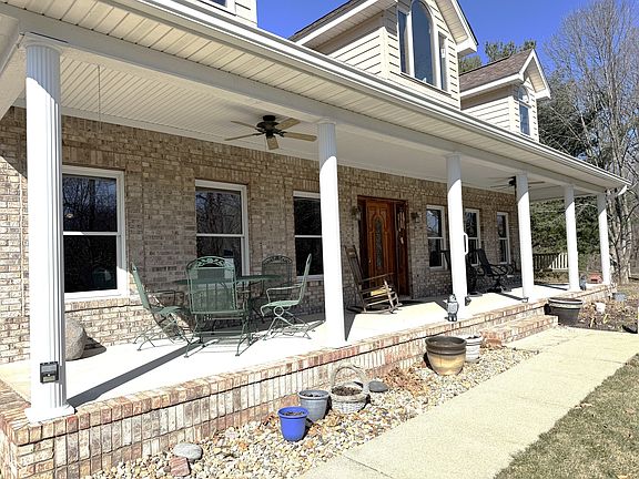 Location! Location Location! Discover your dream retreat at this stunning all-brick custom Cape Cod home. Property is located just 1.8 miles east of interstate 69. Access to the house is by an 800ft private newly paved winding driveway. The house is on a small hill overlooking almost 7 acres of wooded and open grassland that borders Clear Creek. This spacious 2,837 SF home offers the perfect blend of tranquility and convenience. The home features a large, 8x45ft covered front porch, 3 bedrooms, 2 baths, large kitchen, dining room, breakfast room, den and a massive great room which is perfect for gatherings. Additional highlights include a heated detached garage, 29x33ft, with 957 SF living area with full bath and a large multi-purpose room. Recent upgrades such as a new roof, gutters, newly paved drive. Note - The grass field has been maintained for over 20 years, for the grass, by a local farmer. Also, the Association allows 2 horses on the property. Refrigerator and microwave in detached garage are included in sale.