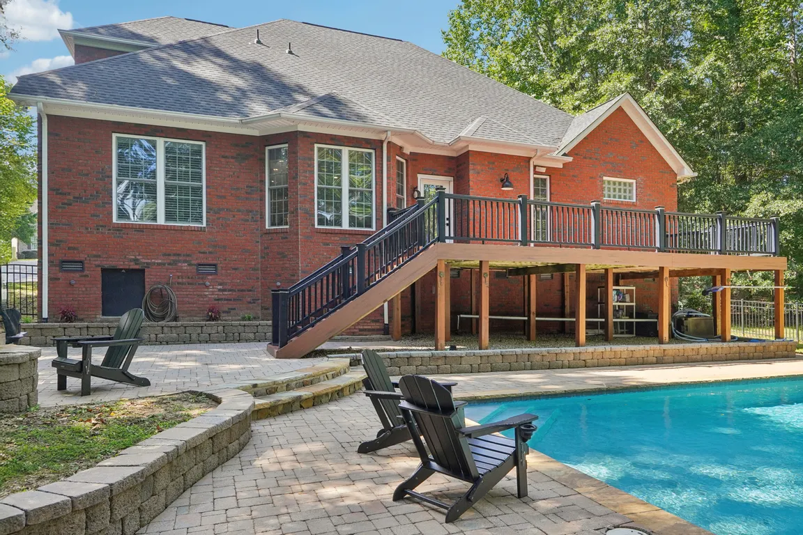 Oversized gas fireplaceRemodeled main-floor guest suiteSparkling in-ground poolCustom brick homeWall oven with microwaveVaulted foyerTwo pantries