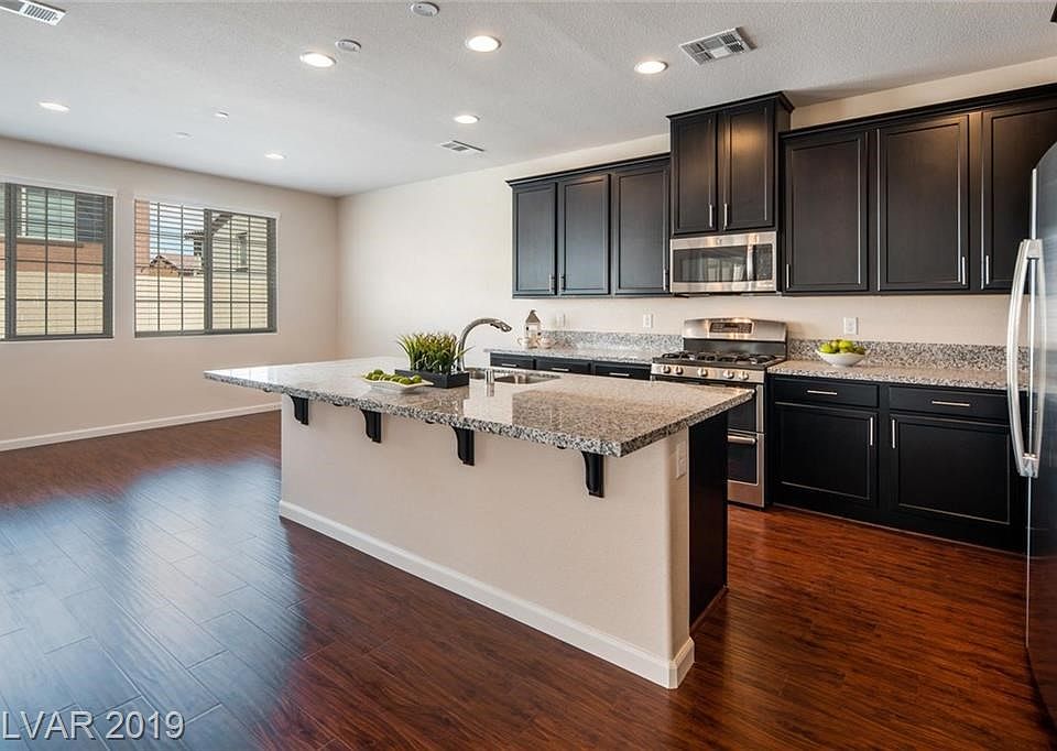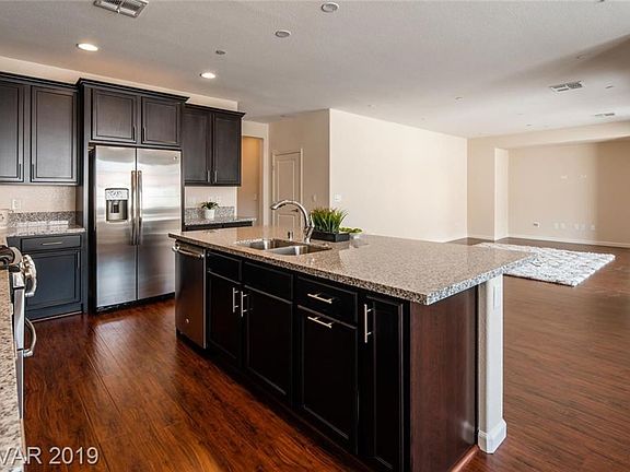 Gorgeous new, never lived in, premier community of Inspirada featuring an exciting lifestyle of pools, parks, tennis, miles of trails. Stylish & comfortable, bright & open layout. Kitchen & family rm flow well with convenient patio slider access creating the ideal space to relax or entertain. Engineered hardwood, stunning granite kitchen, mocha cabs, ss appls, walk-in pantry, under stair storage, All baths have quartz counters & undermount sinks.