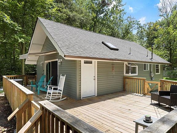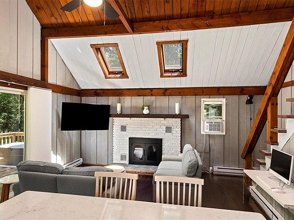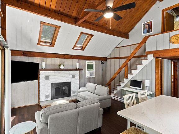 Nestled back in the Pleasant View Lake development sits a completely renovated Chalet home. The brand-new kitchen that opens to an inviting family room with a wood fireplace; the skylights in the cathedral ceiling provide plenty of natural light. Sliding doors open to the front deck that wraps around the side of the home for outdoor entertaining. Past the kitchen, a hallway leads you to the primary bedroom with hardwood floors and 2 closets, and a renovated full bathroom. The last room at the end of the hall is the laundry room offering enough room for full size appliances and extra storage. The large loft with hardwood floors and closet finishes the chalet vibe. The over half acre lot provides plenty of paved parking and a detached garage with electric. Pleasant View was completely renovated in 2023 from head to toe.