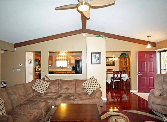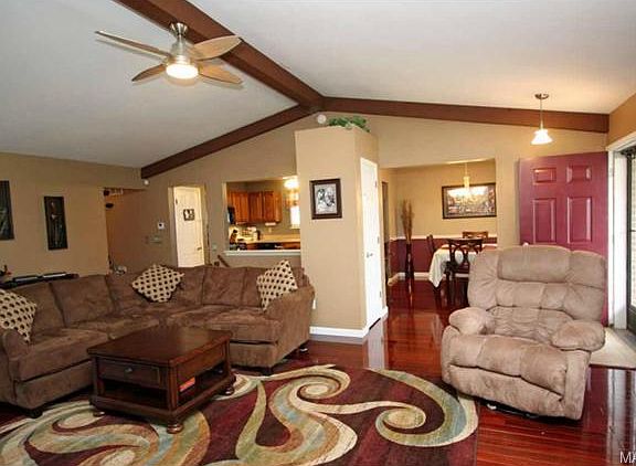 Over 1400 Square Feet of living space in this open, warm, and friendly home. Gorgeous new wood floors in the great room, dining room and hall. Newer flooring throughout. The spacious vaulted great room has a beautiful fireplace and feature wall. Great room opens into the dining room and kitchen. Wonderful gathering space for family and friends. Kitchen has a gas stove, built in micro wave and Corain countertops. Baths have been updated. Enjoy outdoor entertaining on the deck which is a Trex so no maintenance. You will enjoy the tree lined yard backing to common ground. Great for privacy. The exterior has an architectural roof with covered eaves, soffit and fascia, and vinyl siding. Great access to Hwy 364 and 94. Minutes from great shopping and restaurants. A short walk to Laurel Park.