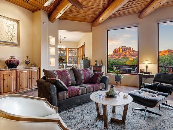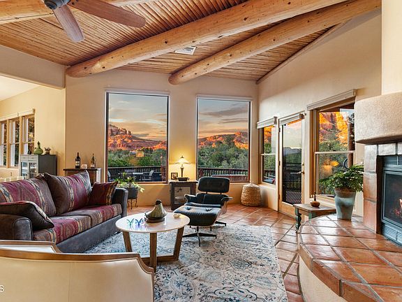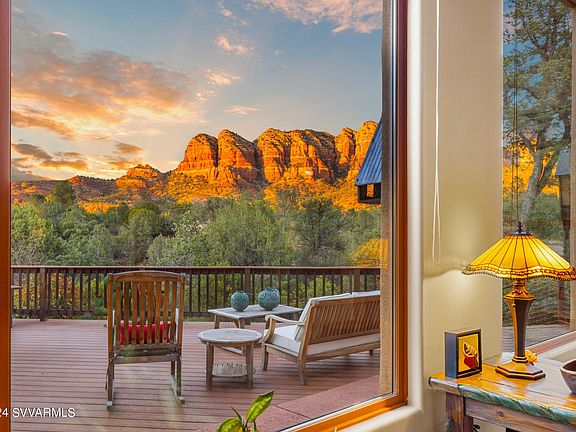Sometimes a property comes along that is exceptional. Exceptional is what you will find when you unlatch the front gate and enter the wonderful magical world at 3040 Verde Valley School Road. Nestled amongst trees on 1.64 acres and hardly seen from the road, one would never know the quintessential architectural gem behind these doors with astounding magical rear facing views with abounding privacy! You will find magic in every breathtakingly beautiful view! Just you wait! Interior is rich with charm, class and distinction abounding with ornamental viga beamed wood ceilings fanning from the center beehive fireplace in the living room passing through to the exterior covered veranda dotted with another beehive wood burning fireplace and anchored with vertical wood columns. Rich Saltillo and wood tile floors are found throughout. Living room is complemented with recessed lighted niches and built in ledges for art pieces. Kitchen is lined with charming country knotty custom cabinetry, wood framed windows and an island boasting a farmhouse sink adding to a charming chic country allure. Living Room, Primary Bedroom, Kitchen and Dining all open onto a back and side yard oasis offering covered veranda's, decks, patios, and stone dotted pathways to myriad sitting areas to take in those enchanting views. A fenced backyard featuring raised beds is perfect for that garden lover or a safe place for Fido. With no neighboring property behind you, slip into hot tub after a long day, relax and watch the stars twinkle above. Primary bedroom ensuite offers a corner beehive fireplace, remodeled bathroom and walk in closet. 2nd bedroom ensuite is perfect for out of town guests or as an in-law suite as it has its own private entrance to the front high walled courtyard, and 3rd bedroom is also an ensuite! 3 lots away from national forest and finished with a separate large laundry room, 2 car garage with extra workshop area and a pass through office, this beauty is a sparkling jewel that is exceptional in every way. Find your way home to a little magic in the magical place called Sedona!