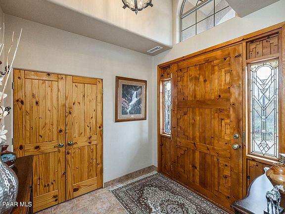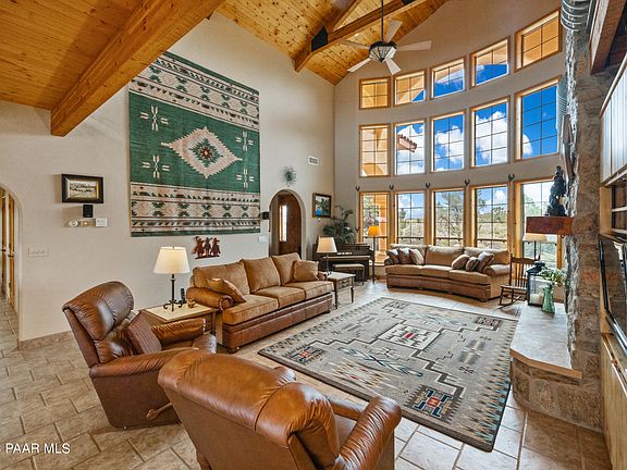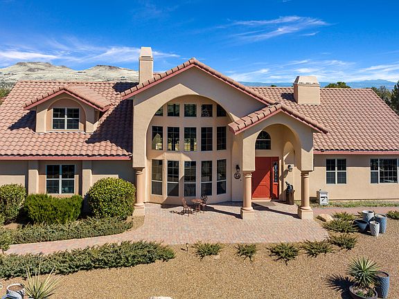 Spectacular views of Granite Mtn, San Francisco Peaks, Mingus Mtn and Bradshaw Mt. This Mediterranean Ranch homes' location is difficult to top, set on 6 acres with over 100 native trees and State Land on two sides, one can enter onto miles of trails for riding or hiking. The home was designed and built to take max advantage of the views and the sun in the winter and shade in the summer. Main level offers 3 bd, 2 ba and laundry room and the upstairs offers 2 bd, one bath and a loft family room. 19-foot ceiling in Great Room with floor to ceiling natural rock fireplace, both gas and wood burning, Open large kitchen, all SS appliances, 2 sinks, island with granite counter top, knotty hickory cabinets. Large pantry room off kitchen with lots of storage, a freezer and a second refrig....