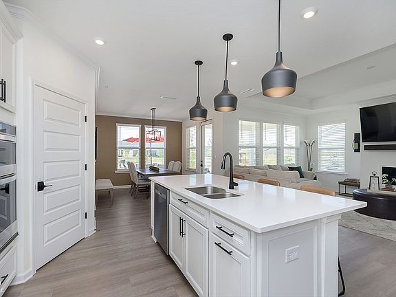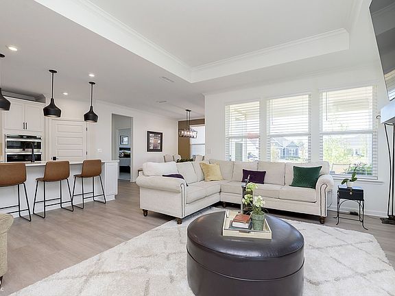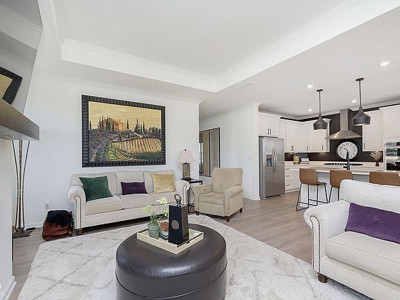 Why build? This beautiful home is a year old and hardly lived in. The extras added after closing are an extended patio, professional landscaping, window treatments, garage floor epoxy, laundry cabinets, and refrigerator. The floor plan is very open and well laid out with a spacious kitchen that includes a large center island, gas cooktop, double ovens, granite, under cabinet lighting, and a pantry. Great Room features easy-to-care-for vinyl plank flooring, a fireplace, and raised tray ceilings. The bedrooms are split for added privacy, and the Primary Retreat offers a large tile shower, double sinks with granite top, and a walk-in closet. The garage has a nice storage area, perfect for a golf cart or storage shelving. The home site is one of the largest, which allows for some space with a huge side yard and additional common area to the back. Relax on the extended patio or covered porch and professionally landscaped privacy screening. Resort-style amenities are amazing, with indoor/outdoor pools, a clubhouse, an exercise room, a golf simulator, tennis, pickleball, and planned activities. Buyer agents welcome. Please see added feature list.