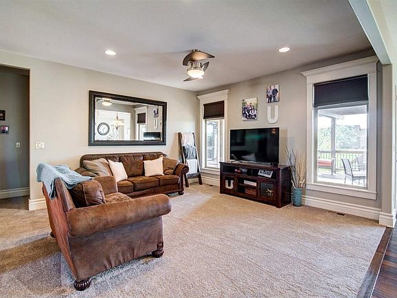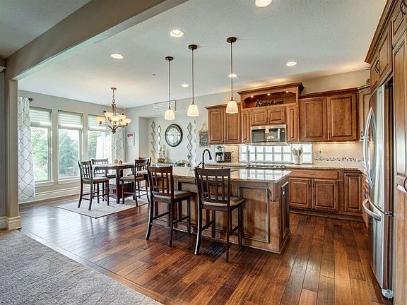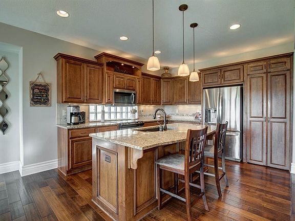 ALL the rooms are spacious in this lovely 4 BR 3 BA 3 Car Garage Ranch in the Retreat neighborhood of Fontana! So close to shops, restaurants and churches in the Maize Road Shopping District and only 2 miles to the Northwest YMCA. You will first notice the awesome curb appeal with lovely landscaping in the front & back. Enter in through the tiled foyer with transom windows. The beautiful great room is truly open concept including the chefs kitchen featuring dark cabinetry, granite countertops, tiled backsplash, walk-in pantry, large island with eating bar and stainless appliances, all stay except the refrigerator. Dark hardwood floors complete the look and continue in the dining area. There is plenty of space to relax in the Master Bedroom with a private exit to the backyard deck. Double vanities/ double sinks, granite counters, jetted tub, step-in tiled shower and tile floors are found in the Master Bath. The laundry area can be conveniently accessed through the large walk-in closet. With a split bedroom plan, a nice sized bedroom and hall bath are located on the opposite of the home. The huge light & bright finished Family Room in the Walk-out/ View- out basement boasts a gas fireplace plus state-of-the-art wet bar boasting hardwood floors, granite countertops, built-in shelving, bar sink, eating bar and space for a dishwasher & small refrigerator. Two additional bedrooms are located here, one of them being 20x11 with double closets, and the 3rd full Bath. Enjoy Kansas sunsets from the covered trex deck overlooking the private backyard. You will want to include this beautiful home in your list of œmust-sees - Call to schedule your private showing today!!