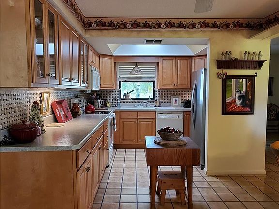 A beautiful home with 3 Bedrooms, 2 1/2 Baths, 2 car oversized garage with screen and extra storage and a separate golf cart garage and a beautiful fireplace in family room, located in the charming Rivergreens Golfing Community. Pride of ownership shows throughout, as this home has been well maintained, with some updates. Kitchen cabinets/countertop updated in 2010 (approx), newer refrigerator/stove. This home has a beautiful view of the golf course that is in the rear of the property, finished driveway, gorgeous landscaping and beautiful thick, St Augustine grass. Lovely curb appeal and no HOA.