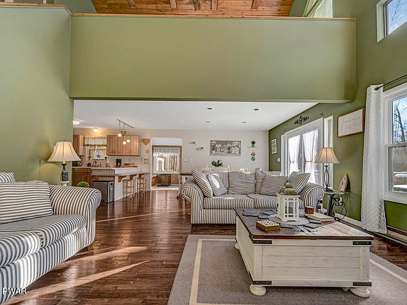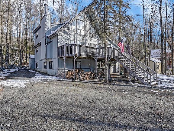 Welcome to your ideal chalet retreat in The Hideout Community in Lake Ariel, the lake region of Northern Poconos. This exquisite 4-bedroom, 3-bathroom home seamlessly blends rustic charm with modern amenities, situated just across from the North Pool Complex, including a pool, playground, tennis court, pickleball, and three-wall handball - all just steps away. Upon entry, the main living area impresses with its spacious layout, characterized by high knotty pine ceilings and hand-scraped hardwood floors. A welcoming fireplace adds coziness, creating an inviting atmosphere enhanced by classic chalet windows that span the entire front, flooding the space with natural light. Adjacent to the dining area, a four-season Florida room features vaulted ceilings and expansive windows, offering a seamless connection to the outdoors and a perfect retreat for enjoying each season. The main level also houses a convenient laundry area. Ascend to the upper level to discover a vast loft overlooking the living room, providing an additional versatile space for various activities. The lower level, a recreational haven, features laminate flooring, knotty pine walls, and a beautifully handcrafted bar area. This space is perfect for entertaining, and it's enhanced by the inclusion of a pool table. The walk-out lower level also houses the fourth bedroom and a third bathroom with a separate whirlpool tub, offering a private and luxurious retreat. Outside, the level property provides easy access, complemented by a one-car garage and storage shed. This chalet home is more than a residence; it's a lifestyle. Embrace the tranquility of Lake Ariel, PA, and make this chalet your retreat in The Hideout Community. Experience the best of both worlds - a serene escape in nature with the added convenience of community amenities. As an added bonus, most furniture is included, ensuring a seamless transition into your dream home. Your idyllic haven awaits!