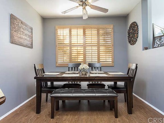 Fantastic three bedroom home in a gated community with lots of modern touches. This home is freshly painted with neutrals grays and laminate wood floors. Newer carpet throughout the upstairs and custom beveled glass window in the stairwell landing. The kitchen has bright white tile and custom modern backsplash with new stainless steel appliances. Sliding glass door leads to cozy yard with a patio cover and no rear neighbors. Owners are having new turf installed as soon as the rain stops. The garage has tons of built in cabinets for an abundance of storage. This home sits in an ideal location just a few minutes from the freeway, shopping, elementary and middle schools.