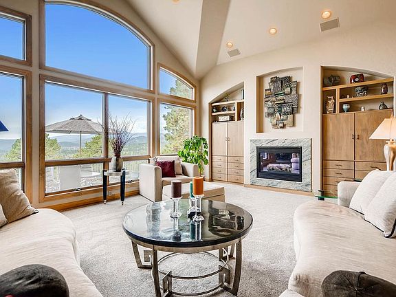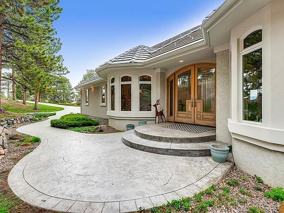 Contemporary Mountain living at its best! This home is nestled along the ridge top with 14' tall south facing windows overlooking the Evergreen valley, Hiwan Country Club and multiple mountain peaks. This sought-after ranch style home with a walkout lower level sits on a 2.66 acres, backs to open space and located on a quiet gated drive. Luxury finishes throughout the house include, gourmet kitchen, granite counter tops, dble ovens, custom Red Birch Cabinets, Portuguese Limestone floors, in-floor radiant heat and 6.26 Kilowatt Solar system. Main floor Mster Bdrm suite with His and Hers vanities and closets, jetted tub, steam shower, and private deck with hot tub. House includes lower walkout level with 9' tall ceilings, billiards rm, 2 wet bars, 2 offices, stamped concrete driveway and patio, 3 fireplaces and outdr fire pit. Enjoy the quite mountain living while only being 5 minutes to I-70 and 30 minutes to downtown Denver. Highly sought-after south facing lot with Mtn views and sun