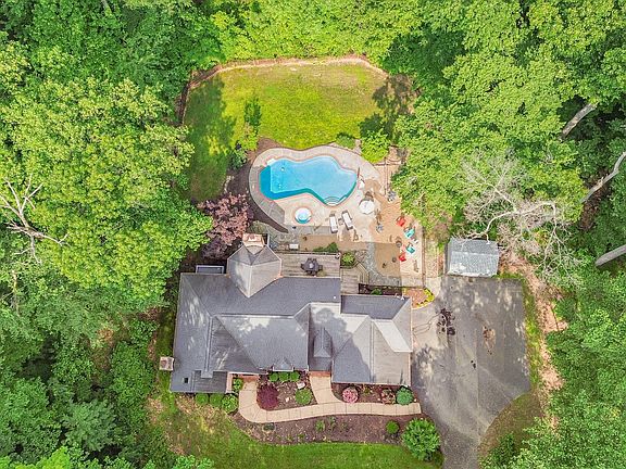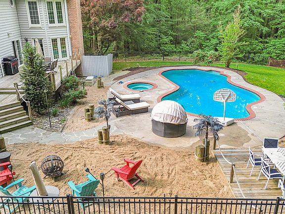 This stunning 5-bedroom, 3.5-bath home offers incredible value with a spacious and thoughtfully designed layout, perfect for both everyday living and entertaining. From the moment you step into the dramatic two-story foyer, you’ll be captivated by the expansive floor plan, rich hardwood floors, and walls of windows that flood the home with natural light. The heart of the home is a gourmet kitchen featuring granite countertops, stainless steel appliances including a gas cooktop, a stylish backsplash, and access to the deck—ideal for outdoor dining with scenic views. The adjacent two-story family room boasts a pellet stove and stunning architectural windows, creating a cozy yet grand atmosphere. Upstairs, you’ll find five generously sized bedrooms and three full baths. The primary suite includes tray ceilings, two walk-in closets, a spa-like bath with dual vanities, a jacuzzi tub, a walk-in shower, and private balcony access. The walkout lower level is fully finished and offers fantastic space for recreation or future expansion, with a rough-in for a bathroom and abundant storage. Step outside to your personal oasis: an exquisite backyard with a large concrete saltwater pool (new pump), relaxing spa, mini beach, patio, and multiple outdoor entertaining spaces. Additional highlights include a main-level office with bay window, french doors, and wet bar connected to the living room with a wood-burning fireplace. There is a spacious laundry/mudroom/drop zone off the oversized 2-car side-load garage (with private access) along with a large storage shed. You'll find recessed lighting throughout, gorgeous molding, custom balusters and more.