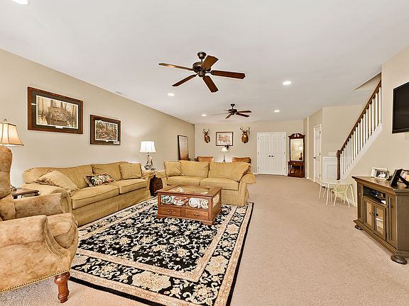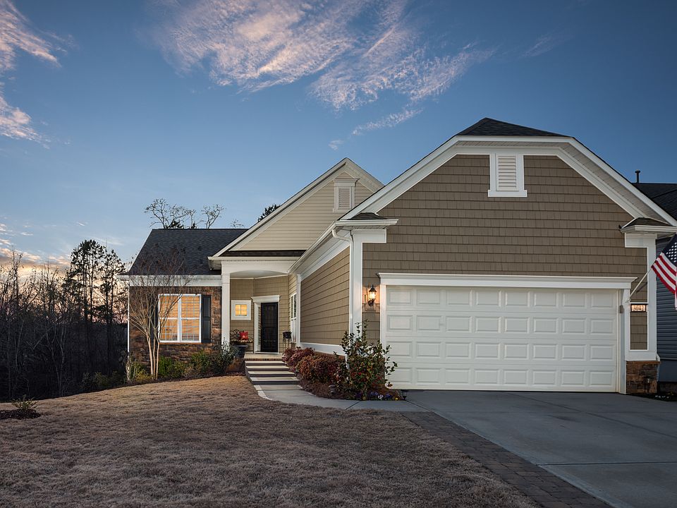 Immaculate CUL DE SAC home in the desired Sun City. Enjoy relaxing outside on the stone patio by the cozy fire pit or in the sunroom overlooking the private, wooded backyard. Master on main. GOURMET kitchen featuring a wall oven, range hood, 5-burner gas cooktop & custom pullouts. Tumbled stone backsplash and granite. Crown molding throughout. 4" Plantation Shutters. Beautiful, 5" Bamboo Wood on the main level. Open Floor plan is perfect for family gatherings or entertaining. Lower level offers a large great room, with expanded storage & utility rooms. 4' Extended garage with epoxy floors. Driveway with expanded side pavers. PRIME location with common open space adjacent & near the Water's Edge Park amenity area. Golf cart community features golf course, ballfields, lakes, pools, restaurant, tennis courts, walking trails.This property qualifies for ZeroPlus mortgage product, which has no lender fees, no origination fees, and potentially $1,000 in 3rd party lender credits.
