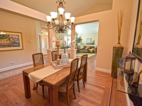 Located in the sought-after Eagle Peak subdivision, this contemporary style one-story home features 3 bedrooms, 2.5 baths, 2,448 sf of living space on an 8,240 sf lot. The recently remodeled spacious floor plan includes high ceilings, picturesque dual pane windows with plantation shutters & blinds, ceiling fans, hickory hardwood & carpet floors, professionally installed drawer & shelf lining throughout the home, custom interior paint, recessed lighting, an intercom system, as well as a security, fire & smoke alarm system. The formal living room offers a wet bar as well as a see-through gas fireplace with a custom mantel and a decorative flame insert that can be seen in the family room. The formal dining room is comprised of walnut inlay flooring, skylights & a chandelier. The kitchen provides granite countertops with tile backsplash, ample cabinets with under lighting, a butler’s pantry, wine cooler, a center island with a prep sink & a breakfast nook. The cozy family room offers a custom built-in entertainment center, a stacked rock surround on the see-through fireplace that connects to the living room, a ceiling fan & sliding glass doors that open to the lush backyard. The office consists of recessed lighting & glass paneled French doors that open to the foyer. The master bedroom provides custom faux paint, a dual light function ceiling fan & a sliding glass door that opens to the backyard. The spacious master bathroom features high profile cabinets with marble countertops & marble backsplash, dual vanities, a jetted spa tub & stall shower with travertine surround, a chandelier & a walk-in closet. The guest bedrooms are comprised of carpet flooring, abundant natural lighting & ample closet space with mirrored closet doors. The guest bathroom includes a dual vanity with onyx countertop, a large mirror & an onyx surround shower over tub. The laundry room features tile flooring, generous cabinets with Corian countertops, & access to the garage. Perfect for entertainment, the backyard offers lush landscaping, a travertine patio with a water feature, a BBQ island that includes bar seating, a built-in BBQ, a built-in ice chest & under lighting. The backyard also provides wrought iron fencing to capture the breathtaking views. The 3-car garage consists of a workbench, an abundance of cabinets for storage, pull down ladder to the attic & an epoxy finished floor. Close to Oakhurst Country Club, downtown, shopping, restaurants, parks and trails along with award-winning Clayton schools! This property is a must see!